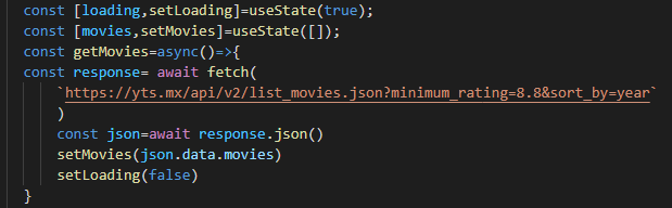 getMovies를 함수 선언한 부분앞에 async 그리고 응답받을 api를 담고있는 fetch앞에 await를 붙이고