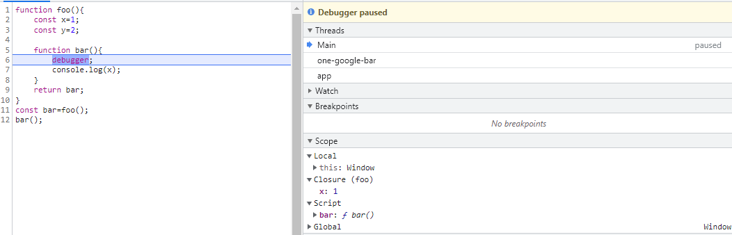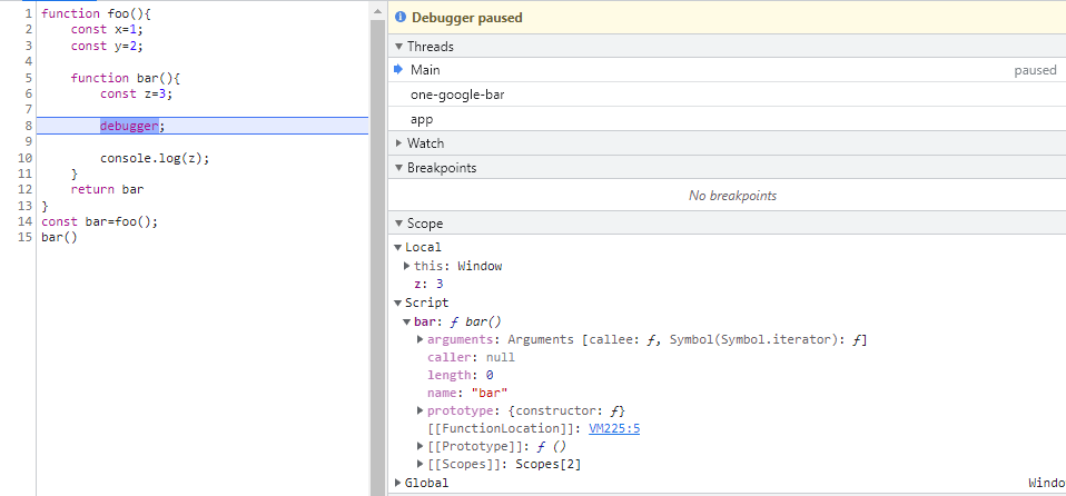셋번째 예제는 bar 함수가 외부 식별자x를 참조한 상태에서 return 되서 외부함수의 생명주기가 끝나도 const bar에서 살아있다.