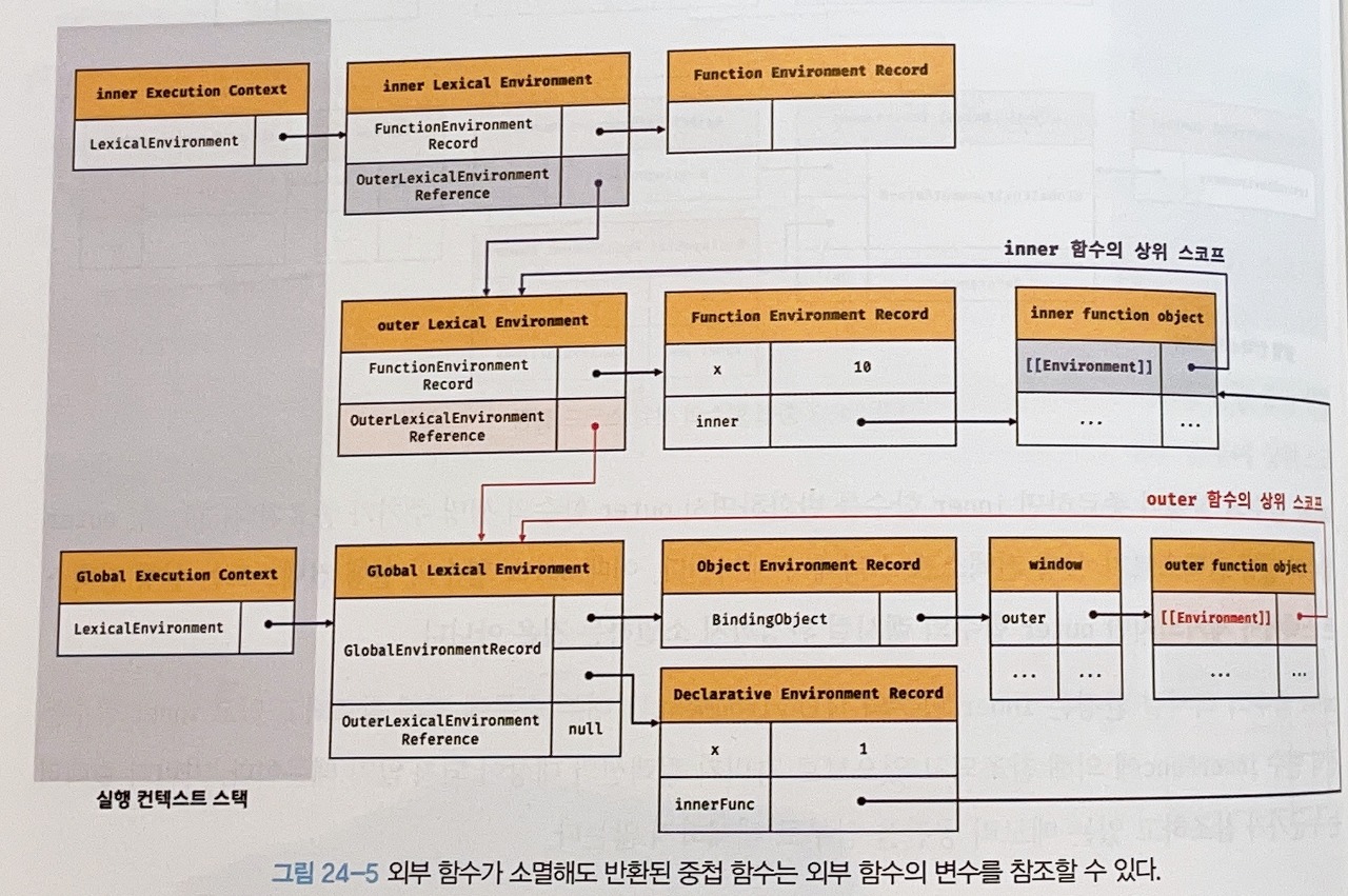 -> outer 함수의 실행 컨텍스트는 실행 컨텍스트 스택에서 제거되지만 outer함수의 렉시컬 환경은 살아있다