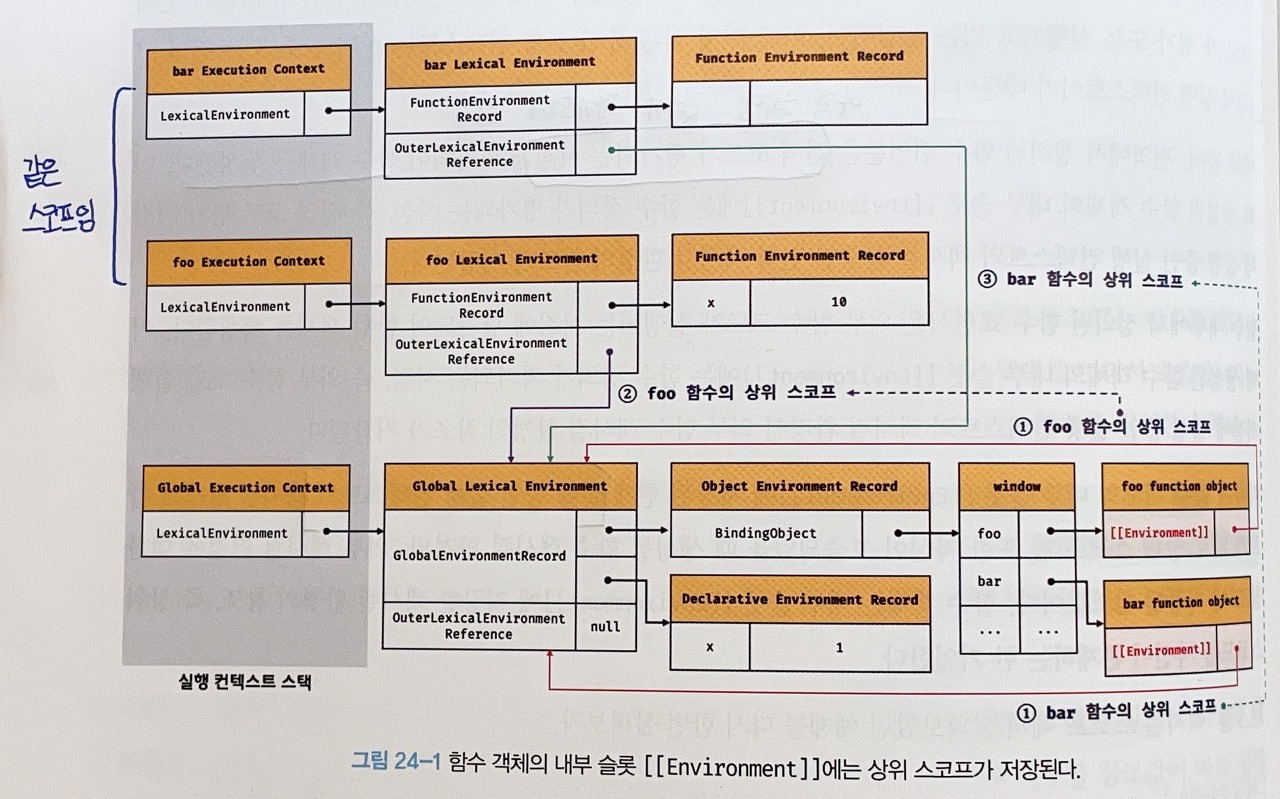 foo() , bar() 의 상위 스코프는 전역스코프 / 스코프에 실체는 실행 컨텍스트의 렉시컬 환경이다.