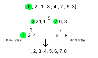 0개 요소,1개 요소 배열이 이미 정렬되있고 그걸 활용해서 배열을 더 작은 배열로 나누는 방식이다(분할 정복)